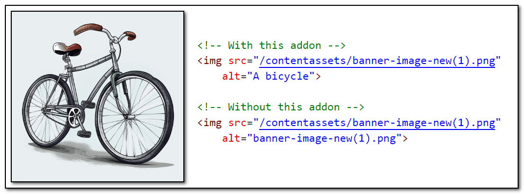}Update the view component for ImageFiles, found in Views.Shared.Components.ImageFile.Default.cshtml and add the alt-attribute. The result might look like this.