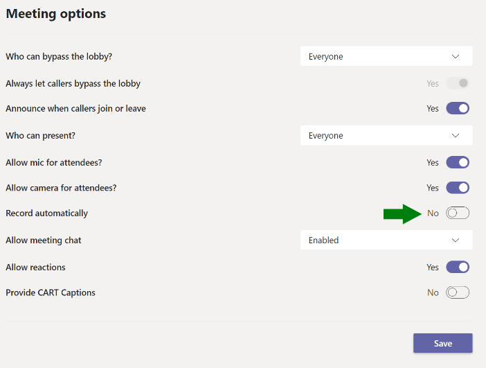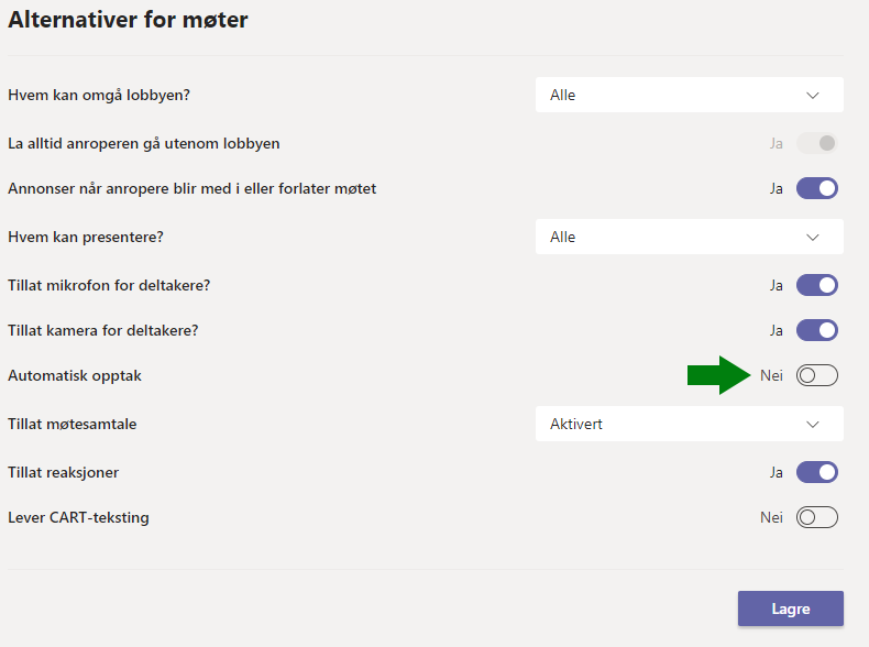 Her kan du gjøre diverse endringer på hva de andre deltagerne har lov til å gjøre, men det interessante her er knappen for "Automatisk opptak". Skyv denne til "Ja", og klikk Lagre.