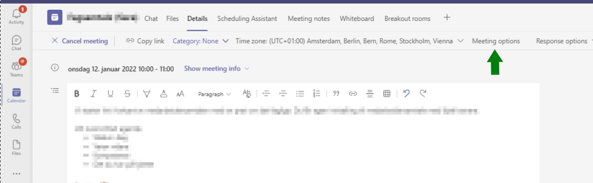 1) Åpne Teams, og Kalender-fanen. Åpne møtet du vil ha automatiske opptak av.