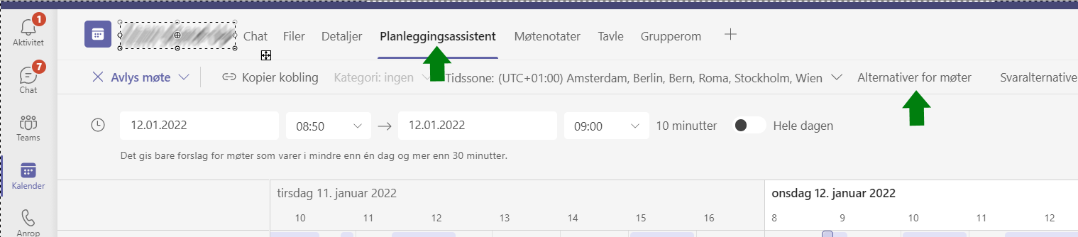 2) Her går du til fanen Planleggingsassistent. Deretter ser du lenken for Alternativer til møter der den andre grønne pilen peker.
