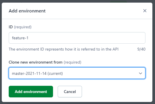 - Name your new environment, for example "feature-1" and make sure you clone the environment currently used in production: