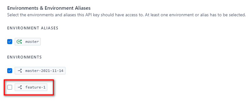 In the above example, my API key is "xyz123". I can either give this API key access to the newly created feature-1 Contentful environment or create a new access token.