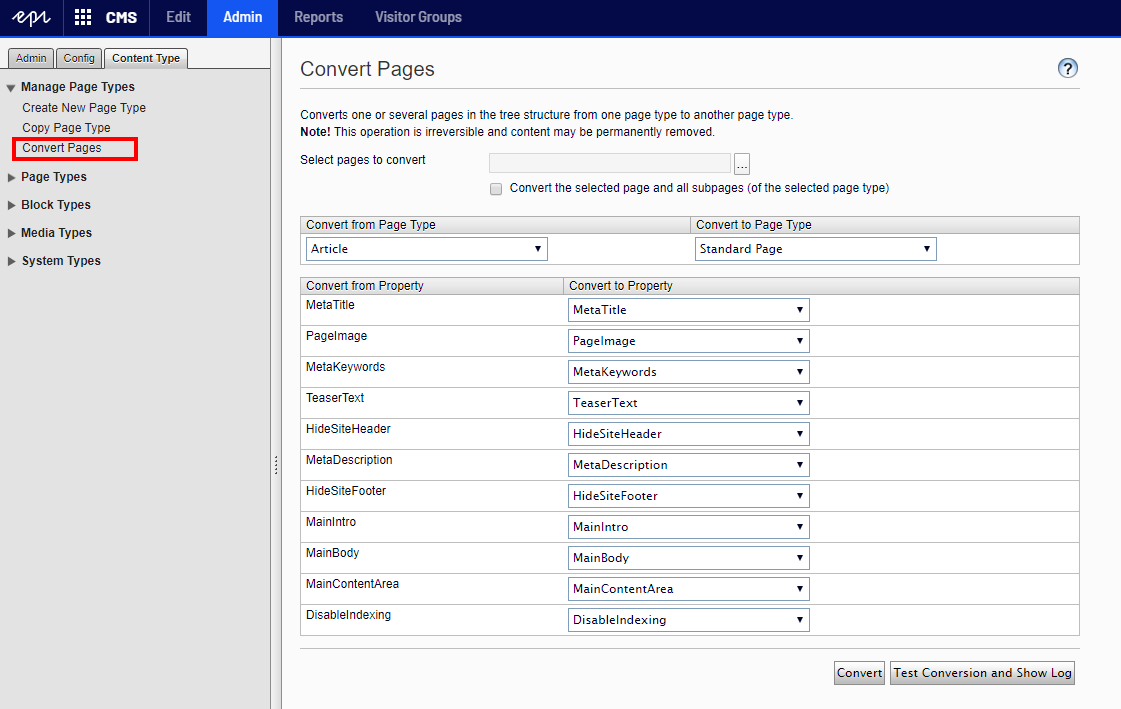 Content in Episerver CMS is organized using pages and blocks. Pages are instances of page types, and blocks are instances of block types. If you by accident create the wrong page type, or you want to move existing pages to a new and enhanced page type, Episerver provides a feature for converting pages to a different page type.
