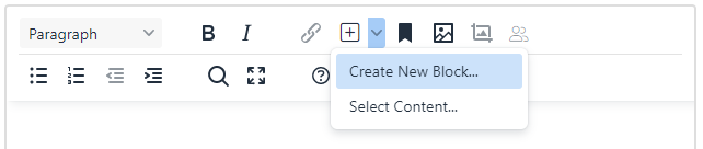 The first option will open a new window where you can create a new block, and then add the block to TinyMCE. The block will be saved in the «For This Page» assets folder.