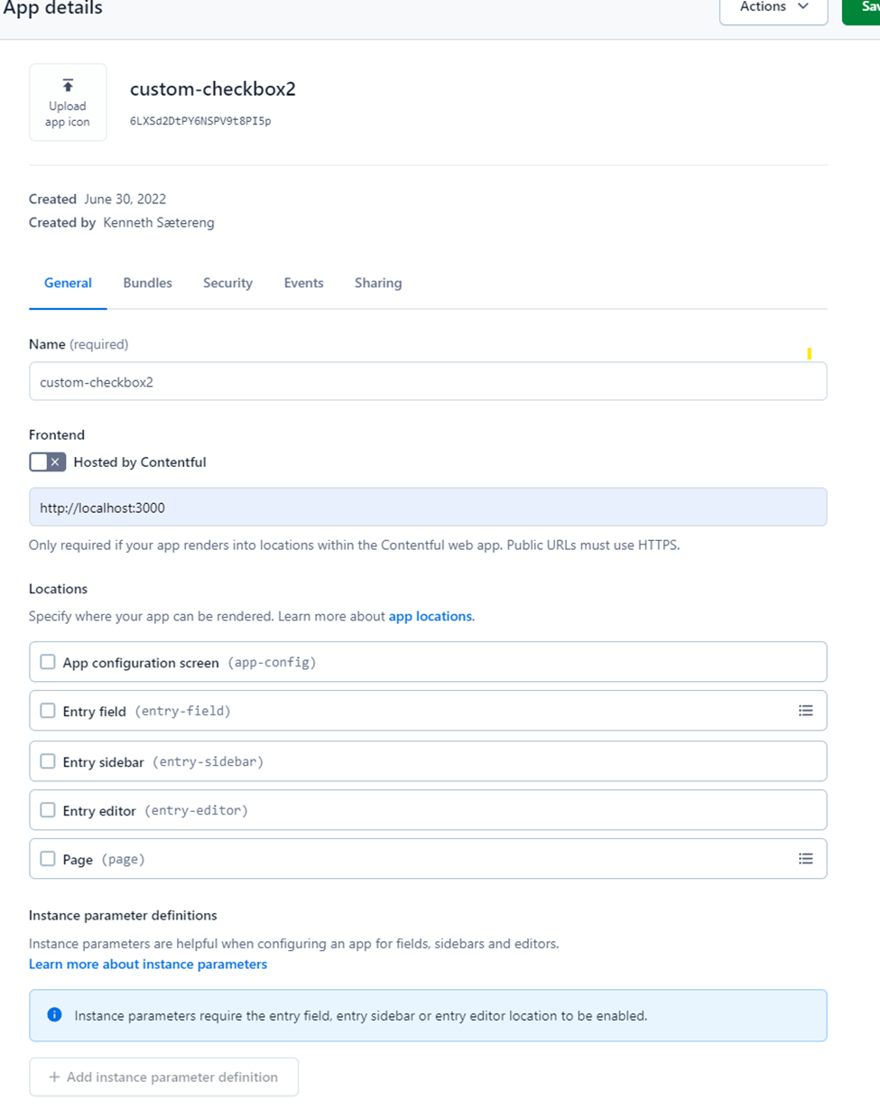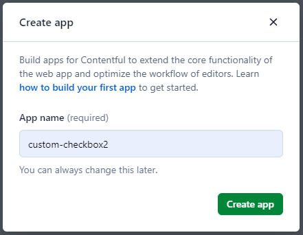 Go to the folder where you want to create your app, open up a command window and type the following code:npx create-contentful-app custom-checkbox2