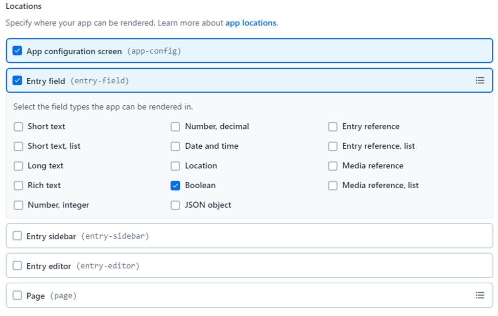 The next step is to choose which part of our content we want to change. I’m selecting App configuration screen and Entry field -> Boolean