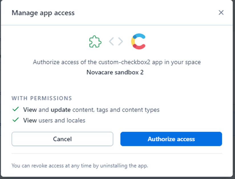 Next - go back to Contenful and the list of available apps - click on your app and select Authorize access, and your app will be installed for you.