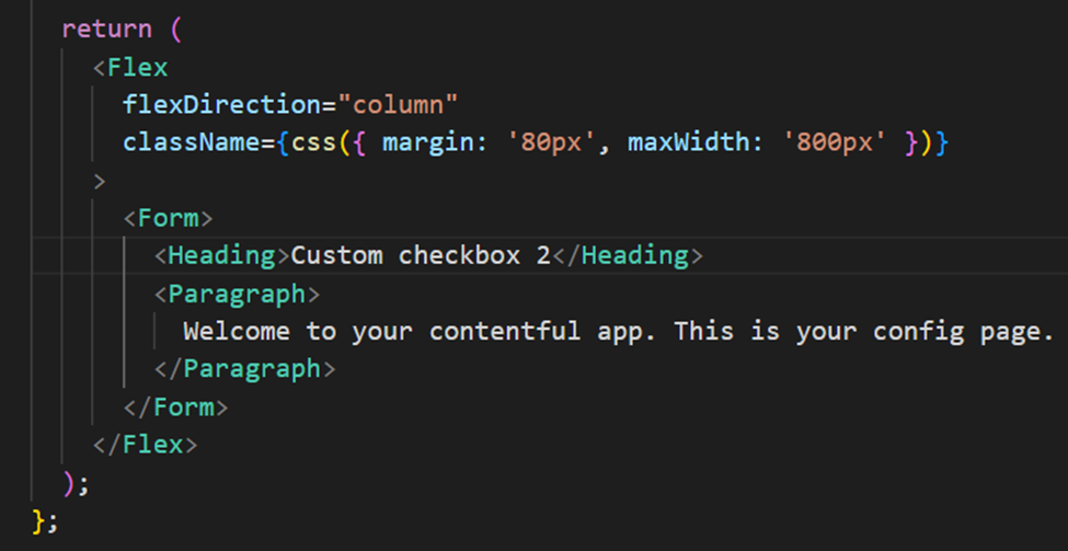 Go back to your code – into the Field.tsx file. In the top import the Checkbox component from f36-components delivered by Contentful:import { Paragraph, Checkbox } from '@contentful/f36-components';