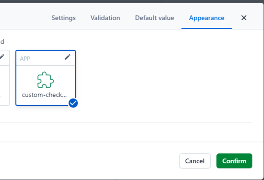 Next go to your Content Model and into the Content type and Entry field you would like your new app to be applied. Go to Settings of your field and the Appearance tab where your app should be visible. Select it and click Confirm – next Save your Content Model.