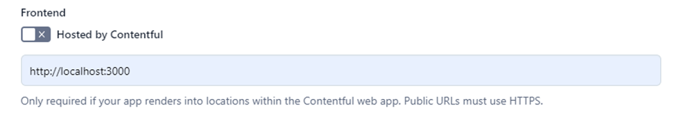 Go into Contentful under organization settings and apps. Choose your app, where we previously set http://localhost:3000 switch the Hosted by Contentful to true.