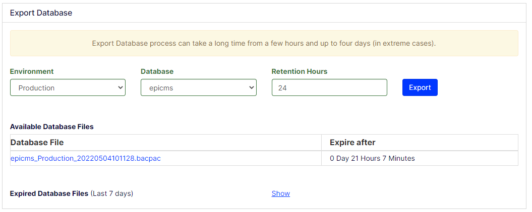 The database export can be started from the self-service portal. You simply select the environment, the database, and for how long you want it stored.