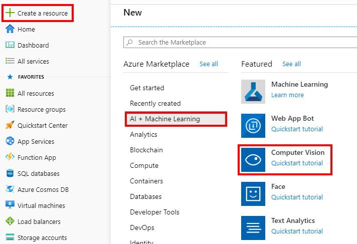 I'll start by creating an Azure Cognitive Services Computer Vision resource using the Azure portal. It's as easy as clicking here, here and here: