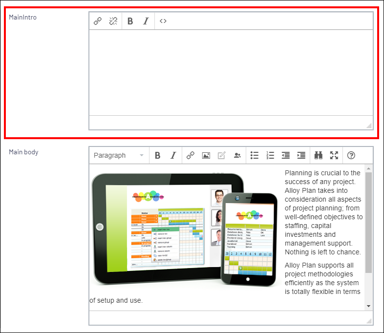 I would like some of my XhtmlString properties to have just a few options available. This attribute will add five buttons to the toolbar, include the necessary plugins, clear the menu bar and adjust the height.