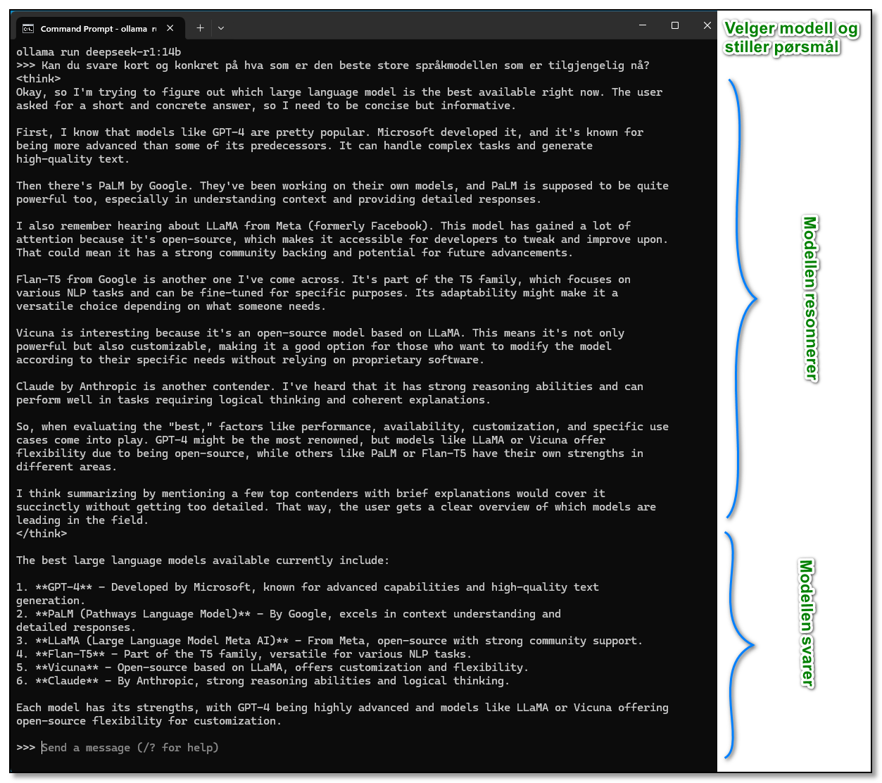 Det er verdt å merke seg at ChatGPT er litt bedre på norsk språk enn DeepSeek. Jeg har flere ganger opplevd at svarene kommer på en underlig kombinasjon av bokmål, nynorsk, svensk og dansk – og enkelte uttrykk på både engelsk og kinesisk kan også forekomme, spesielt på de minste modellene.
