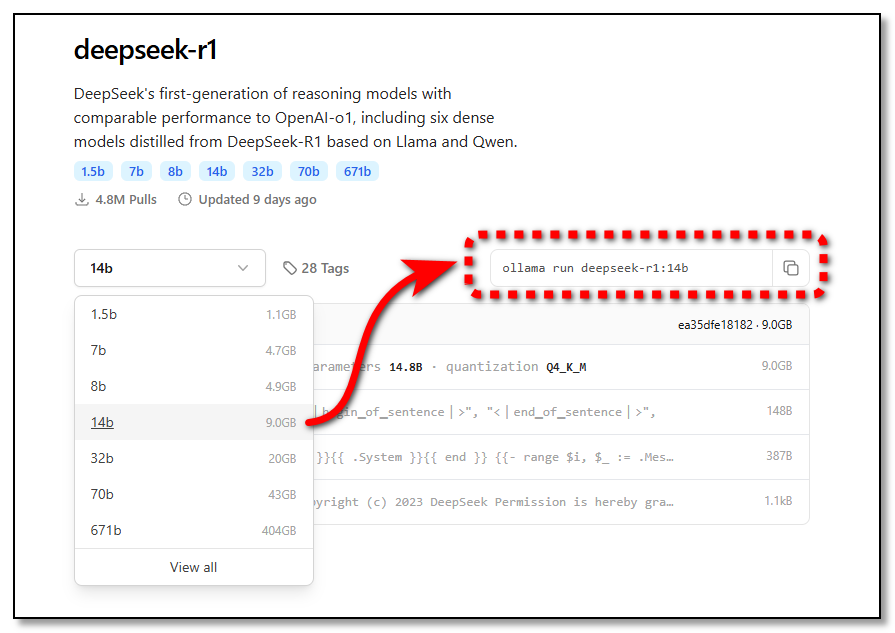 Bare kopier ollama-kommandoen og kjør den fra kommandolinjen. Modellen lastes ned første gang du kjører den, og vil deretter være klar til bruk.