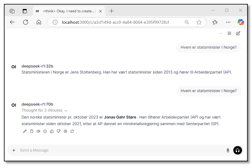 Der 32B-varianten gir feil svar umiddelbart, tenker 70B-varianten seg om i to minutter før den kommer med det riktige svaret. Men, nå er jo ikke en språkmodell ment å være et oppslagsverk heller!