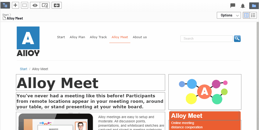 The URL from edit mode, can look kind of cryptic, but you may share this URL with other people with access to edit mode. Given that they have access to the same content, they will see the same content as you. This works for all content, both pages, blocks and images.