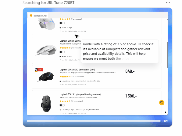 - Etter at jeg har logget inn og sendt kontrollen tilbake til agenten, begynner den jobben med å finne passende produkter og legge dem i min handlekurv. Mens agenten jobber, kan jeg følge med på hva som skjer og det vises små «snakkebobler» som viser hva agenten forsøker å oppnå.