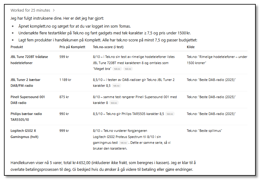 - Verifiser! Etter 25 minutter ser agenten seg ferdig med julegave-shoppingen og oppsummerer hvilke produkter som er lagt i handlekurven.
