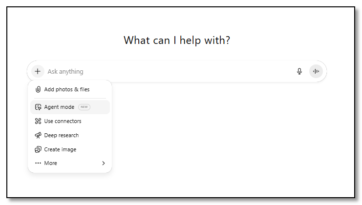 I agent-modus kan ChatGPT utføre arbeid for deg på sin egen datamaskin, samtidig som den resonerer. I motsetning til «vanlig ChatGPT», som kun svarer i samtalen, kan en agent faktisk utføre handlinger og følge oppgaver over tid. Det er spesielt godt egnet for repeterende og tidkrevende oppgaver, og du kan enkelt avbryte og ta over kontrollen hvis det skulle føles nødvendig.