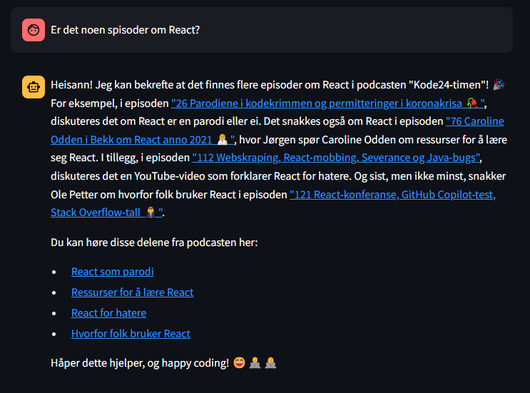 Så hva er det her for noe og hvordan løser vi disse utfordringene? Jo vi (eller jeg da) har laget en applikasjon der du rett og slett kan chatte med, og stille spørsmål til kode24-timen. Her er noen eksempler:
