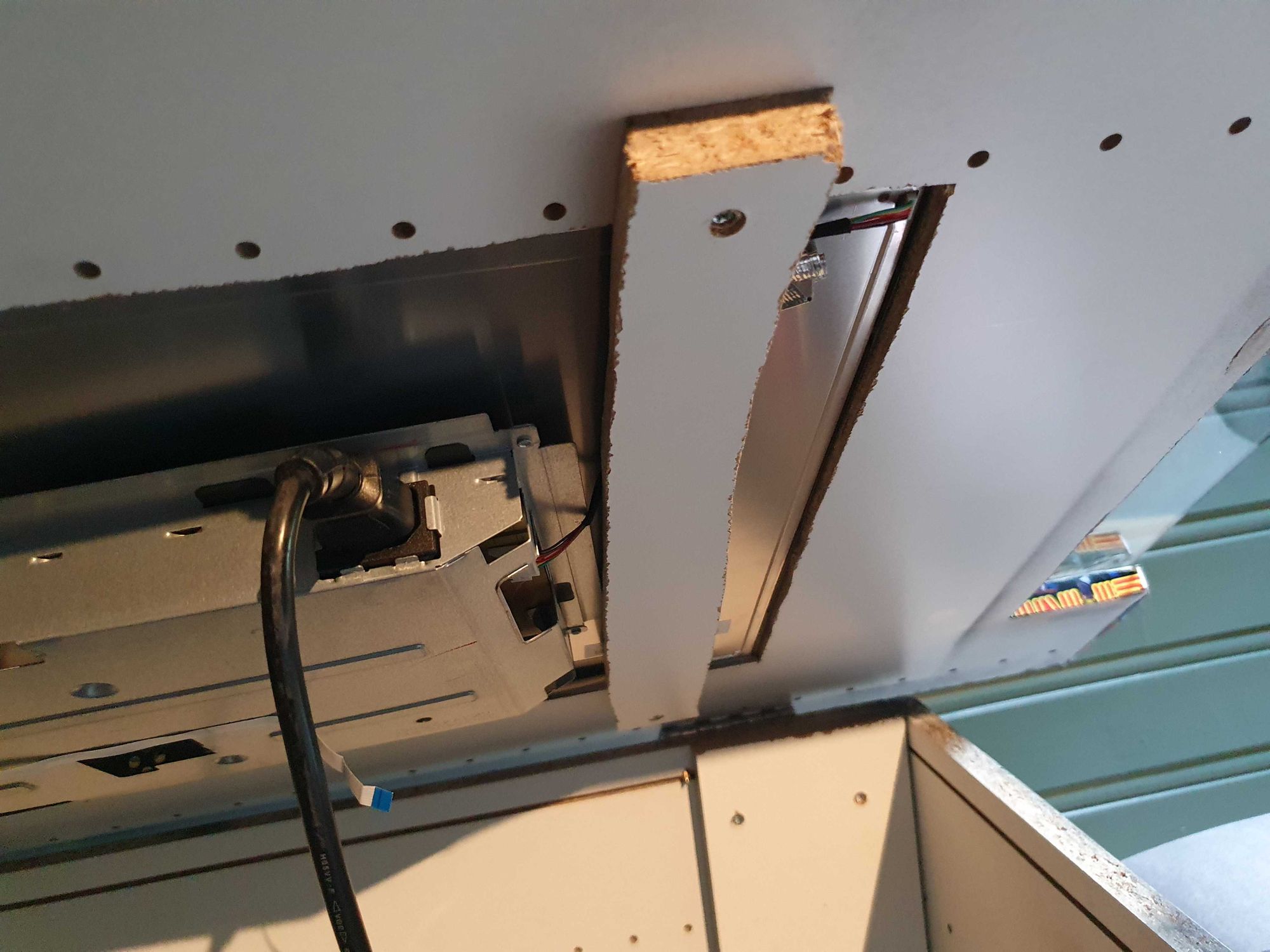 - The holes in the top need to be cut out. After cutting out the top, we need to have a mount to hold the screen. I took some leftover wood scraps and made a simple mount to hold the screen in place. I also peeled the excess plastic off the screen to make it smaller.
