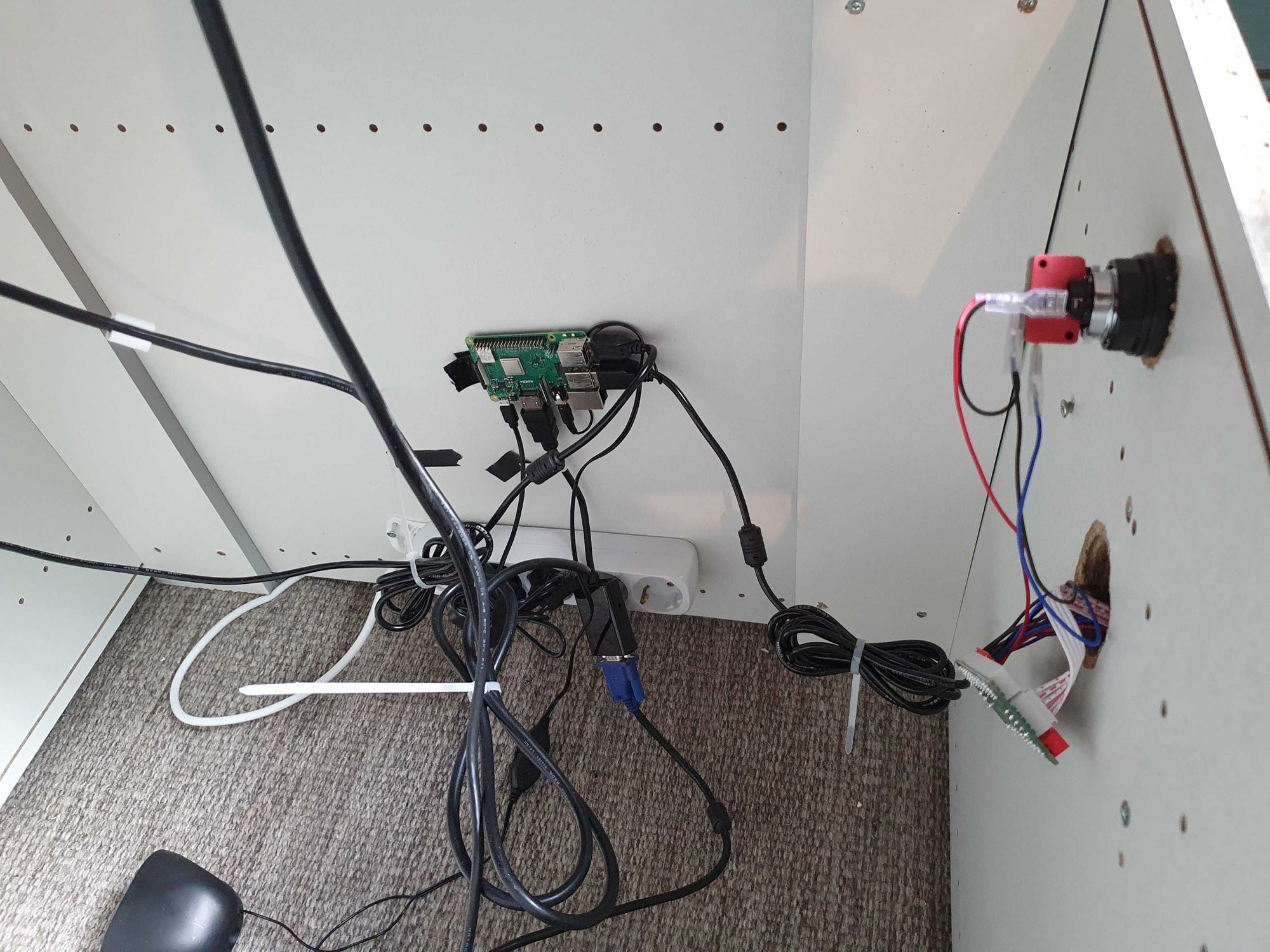 - This is what the insides look like. Controllers, speakers, and screen all connected to the Raspberry Pi. All power is provided by the power strip. The Pi and power strip is fastened with velcro.