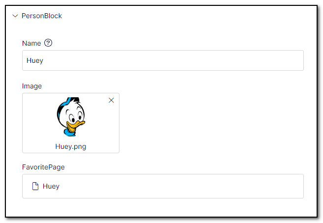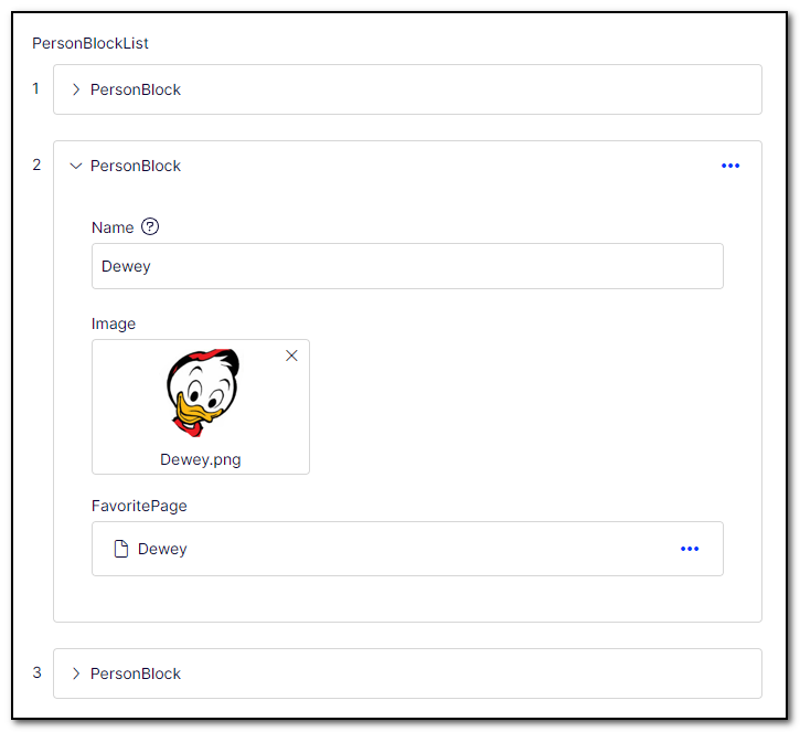 - When all blocks are collapsed they all look the same. I would like to be able to define a property that is shown instead of the block name («PersonBlock» in the above example) when the block is collapsed. For Persons the Name-property would be an obvious choice.