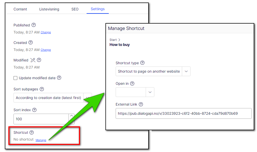 In Optimizely CMS you can manage an optional shortcut for all pages. There are different types of shortcut.