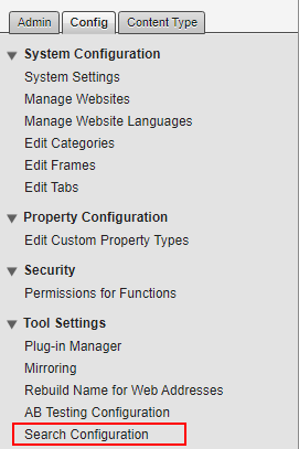 }Finally, I enter the admin mode to tell Episerver to use my new search provider. Locate the Search Configuration, on the Config tab.
