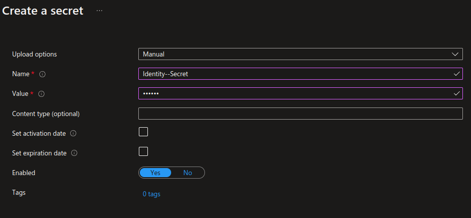 The path In the key vault we simply name the secret "Identity--Secret" to resolve it correctly. Retrieving it from configuration in code: `["Identity:Secret"]`.