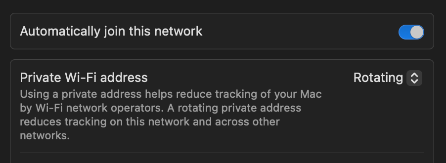 • Enable Rotating Private Wi-Fi Address: Reduces tracking on the connected network.
