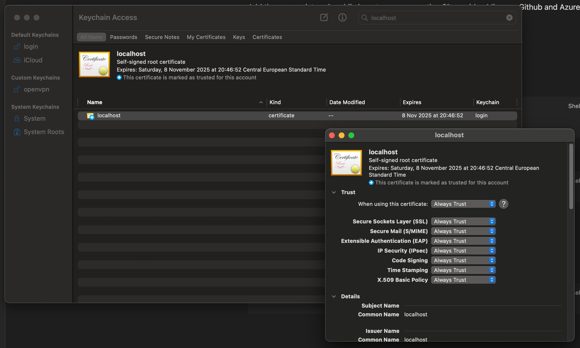 Enter the "Keychain Access" app and search for the certificate "localhost". Double-click and expand "Trust". Set "When using this certificate" to "Always trust".