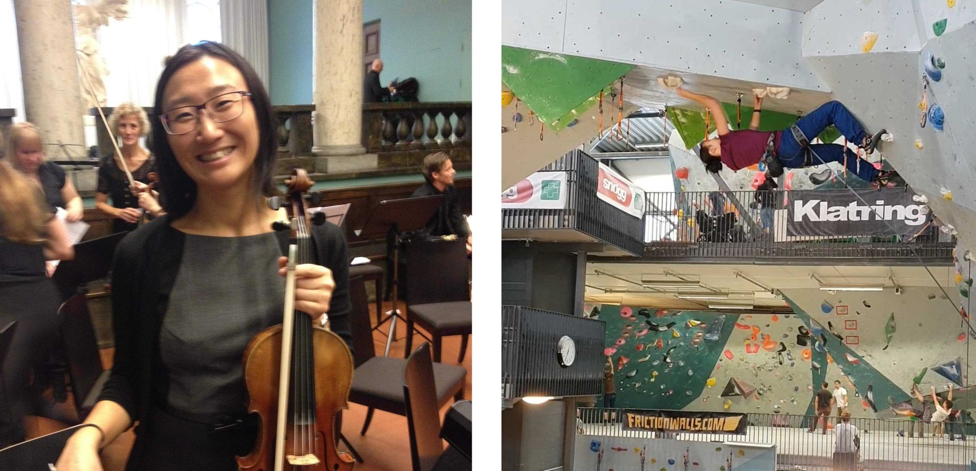 Bortsett fra å være sammen med venner, spiller jeg fiolin og klatrer på fritiden.