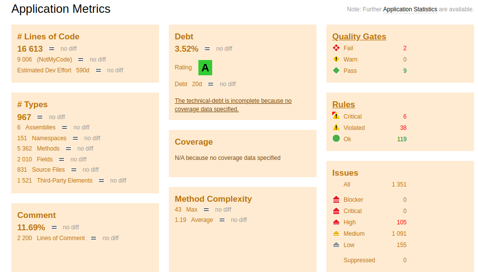 NDepend gives you a score on the amount of technical debt in your solution. I'm quite happy that I've received an "A" rating. However, my code isn't perfect. 3.52% debt as you can see. There are many things that the report picks up that Visual Studio or Rider doesn't. Here are some of the things that I experienced.