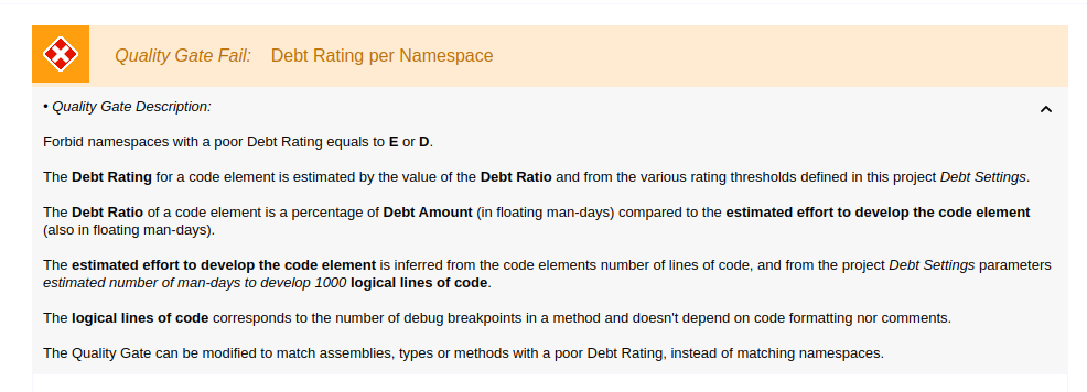 NDepend lets you see the debt per namespace. A nice way to determine debt in a certain area of your code. You can also set the parts of your code that don't need to be analyzed.