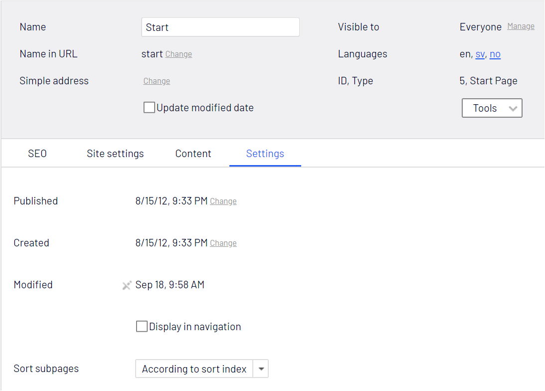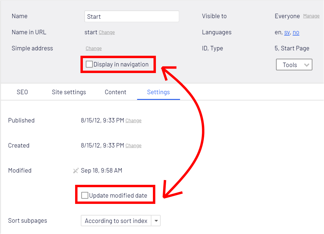 What if editors never use the property «Display in navigation», but very often need to use «Update modified date»? Wouldn't it be more practical if they switched places? We can do that!